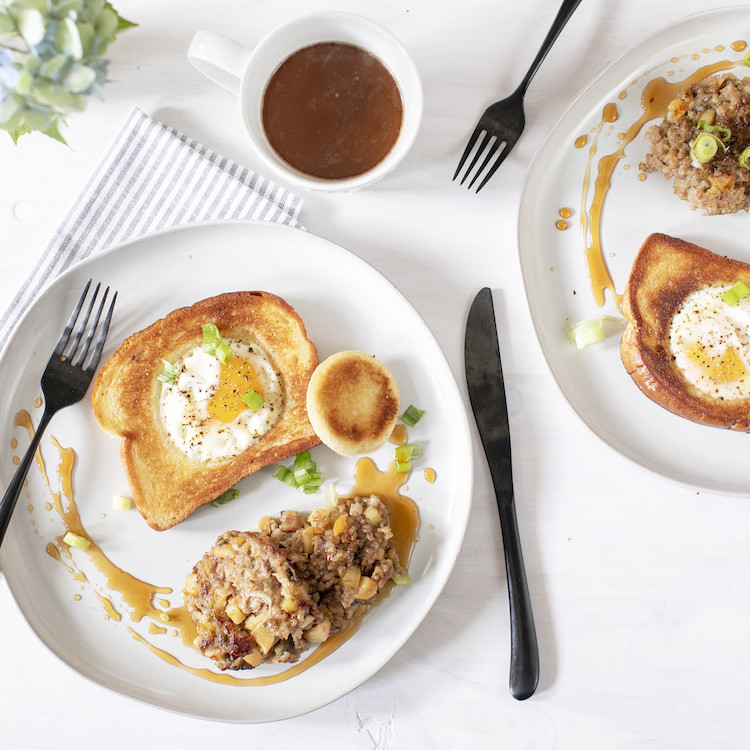 Reimagine Riverview Farm's Italian sausage when you form it into breakfast patties featuring cheddar cheese, fragrant sage & local apples. Make your egg in a hole using thick slices of TGM Bread's challah with a Rise 'n Shine egg cracked into the center. Simmer together maple syrup & cider vinegar for a delectable sauce to drizzle over everything.